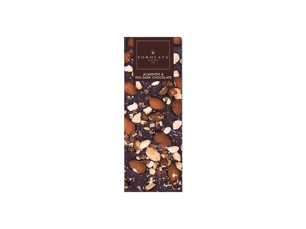 Složení: 70% hořká čokoláda (90%) (cukr, kakaové máslo, kakaová hmota, sojový lecitín, přírodní vanilková příchuť), mandle (10%). Obsah kakaa 64,8%.