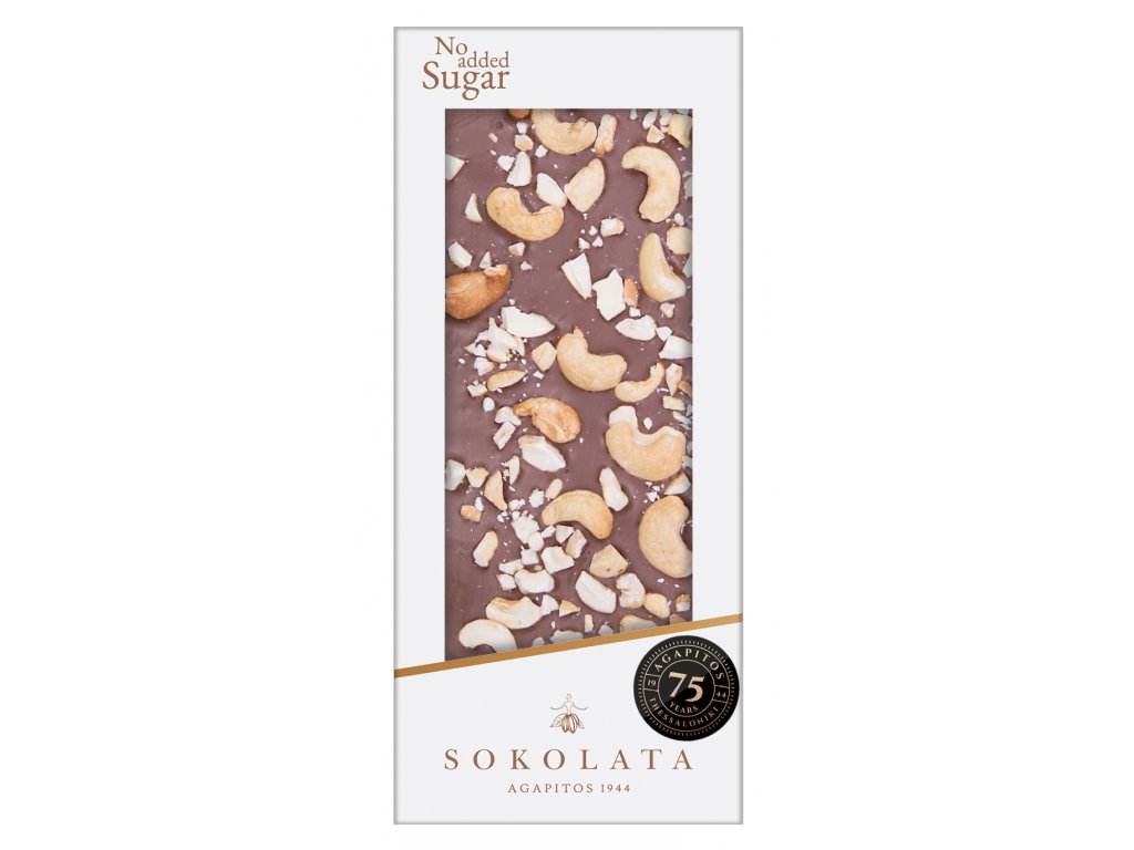 Složení: čokoláda (34% kakaa - stévia a maltitol, kakaové máslo, kakaová hmota, sušené plnotučné mléko, sójový lecitin, vanilín), 10% kešu.