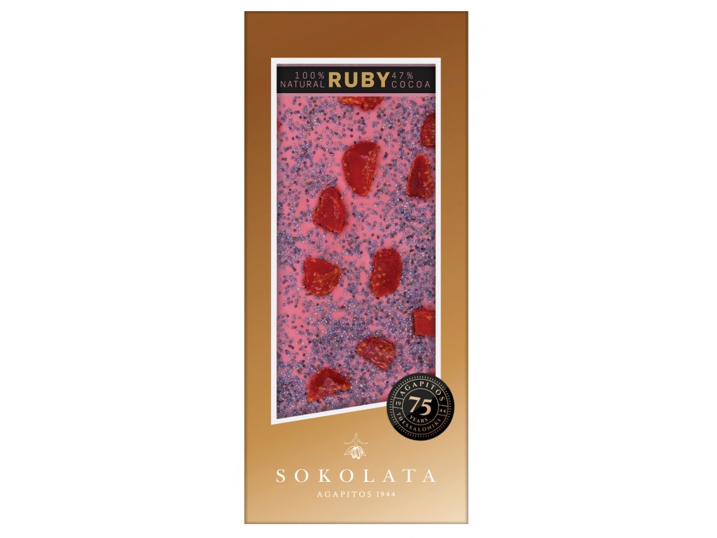 Složení: Ruby čokoláda 90% (cukr, kakaové máslo, odstředěné sušené mléko, plnotučné sušené mléko, kakaová hmota, sójový lecitin, kyselina citrónová, přírodní vanilková příchuť), sušené jahody 8%, maková zrnka 2%.
