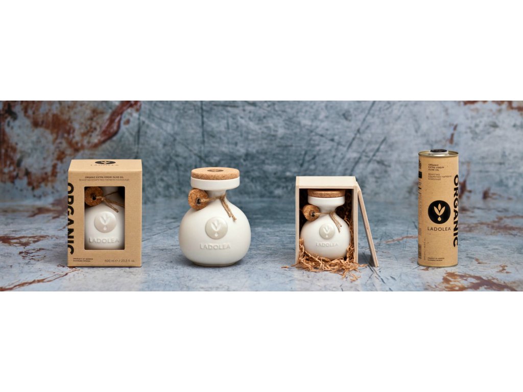 Ladolea oleje a ocet jsou uchovány v ručně vyrobené keramické nádobě. Inspirace pochází z bohaté historie řeckého regionu Corinthos. Podobné nádoby byly vyráběny již v roce 700 před Kristem a nazývají se Aryballos. Tato nádoba byla používána mimo jiné olympijskými atlety, kteří v ní uchovávali olivový olej, jímž se potírali. Stejně tak bohatí aristokraté v Aryballos nádobách uchovávali hodnotné esenciální oleje a aromata. Společnost Ladolea změnila design nádoby Aryballos a vytvořila tak úžasnou kombinaci antického a moderního designu. Nádoba je praktická pro servírování olivového oleje a samozřejmě splňuje veškeré normy a certifikace. Tmavá nádoba je navíc ideální pro uchování olivového oleje, který si tak zachovává své aroma a chuť. Nádoby jsou vyráběny exkluzivně pro Ladoleu.