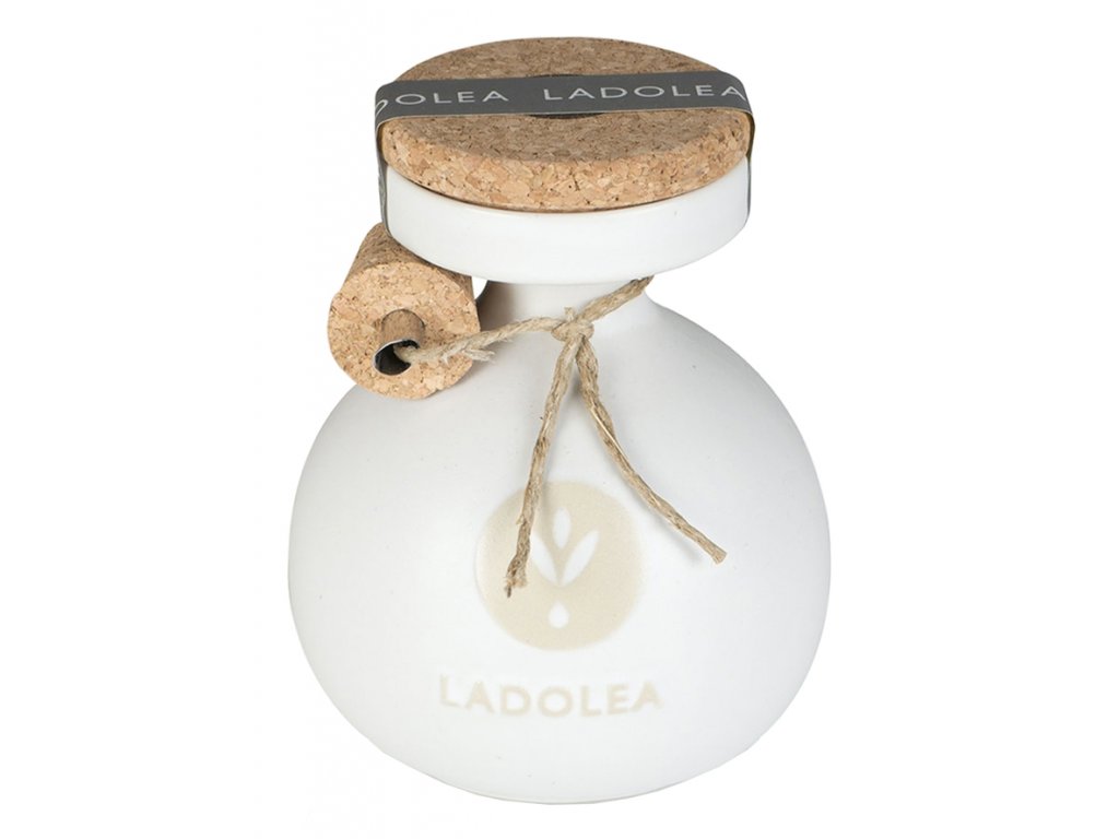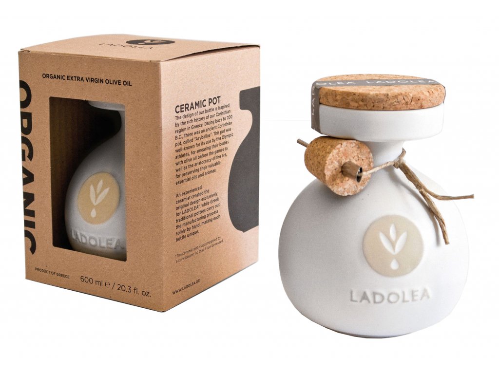 Olej v plechovce můžete použít pro doplnění v ručně vyrobené keramické nádoby. Inspirace pochází z bohaté historie řeckého regionu Corinthos. Podobné nádoby byly vyráběny již v roce 700 před Kristem a nazývají se Aryballos. Tato nádoba byla používána mimo jiné olympijskými atlety, kteří v ní uchovávali olivový olej, jímž se potírali. Stejně tak bohatí aristokraté v Aryballos nádobách uchovávali hodnotné esenciální oleje a aromata. Společnost Ladolea změnila design nádoby Aryballos a vytvořila tak úžasnou kombinaci antického a moderního designu. Nádoba je praktická pro servírování olivového oleje a samozřejmě splňuje veškeré normy a certifikace. Tmavá nádoba je navíc ideální pro uchování olivového oleje, který si tak zachovává své aroma a chuť. Nádoby jsou vyráběny exkluzivně pro Ladoleu.