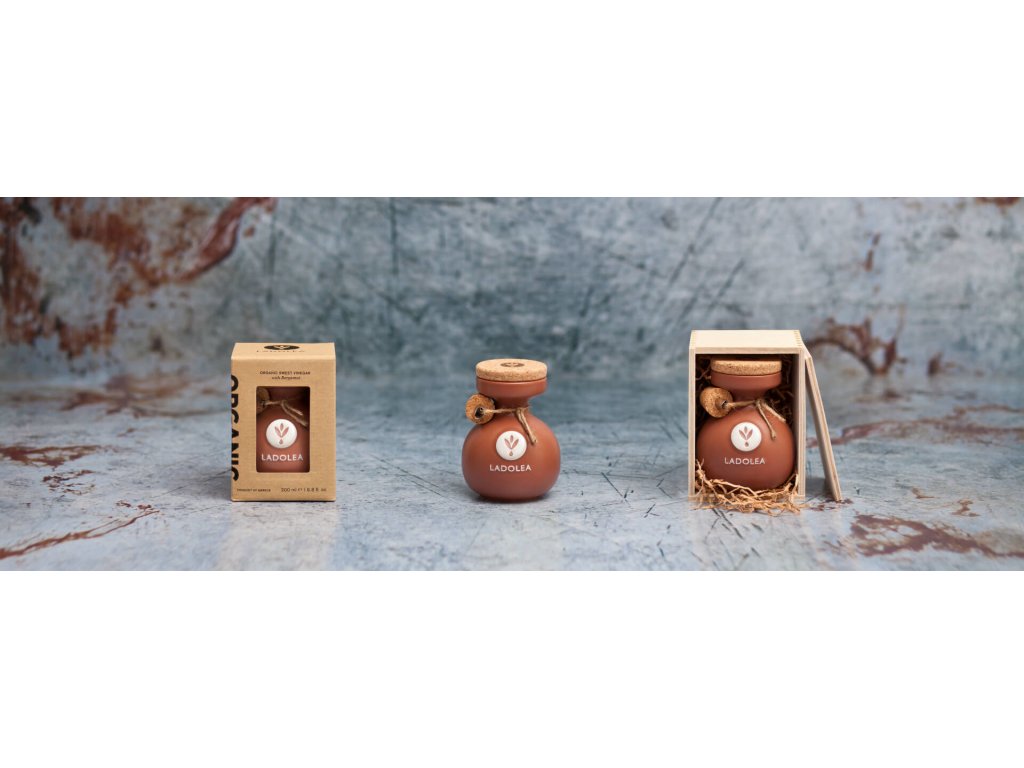 Ladolea oleje a ocet jsou uchovány v ručně vyrobené keramické nádobě. Inspirace pochází z bohaté historie řeckého regionu Corinthos. Podobné nádoby byly vyráběny již v roce 700 před Kristem a nazývají se Aryballos. Tato nádoba byla používána mimo jiné olympijskými atlety, kteří v ní uchovávali olivový olej, jímž se potírali. Stejně tak bohatí aristokraté v Aryballos nádobách uchovávali hodnotné esenciální oleje a aromata. Společnost Ladolea změnila design nádoby Aryballos a vytvořila tak úžasnou kombinaci antického a moderního designu. Nádoba je praktická pro servírování olivového oleje a samozřejmě splňuje veškeré normy a certifikace. Tmavá nádoba je navíc ideální pro uchování olivového oleje, který si tak zachovává své aroma a chuť. Nádoby jsou vyráběny exkluzivně pro Ladoleu.